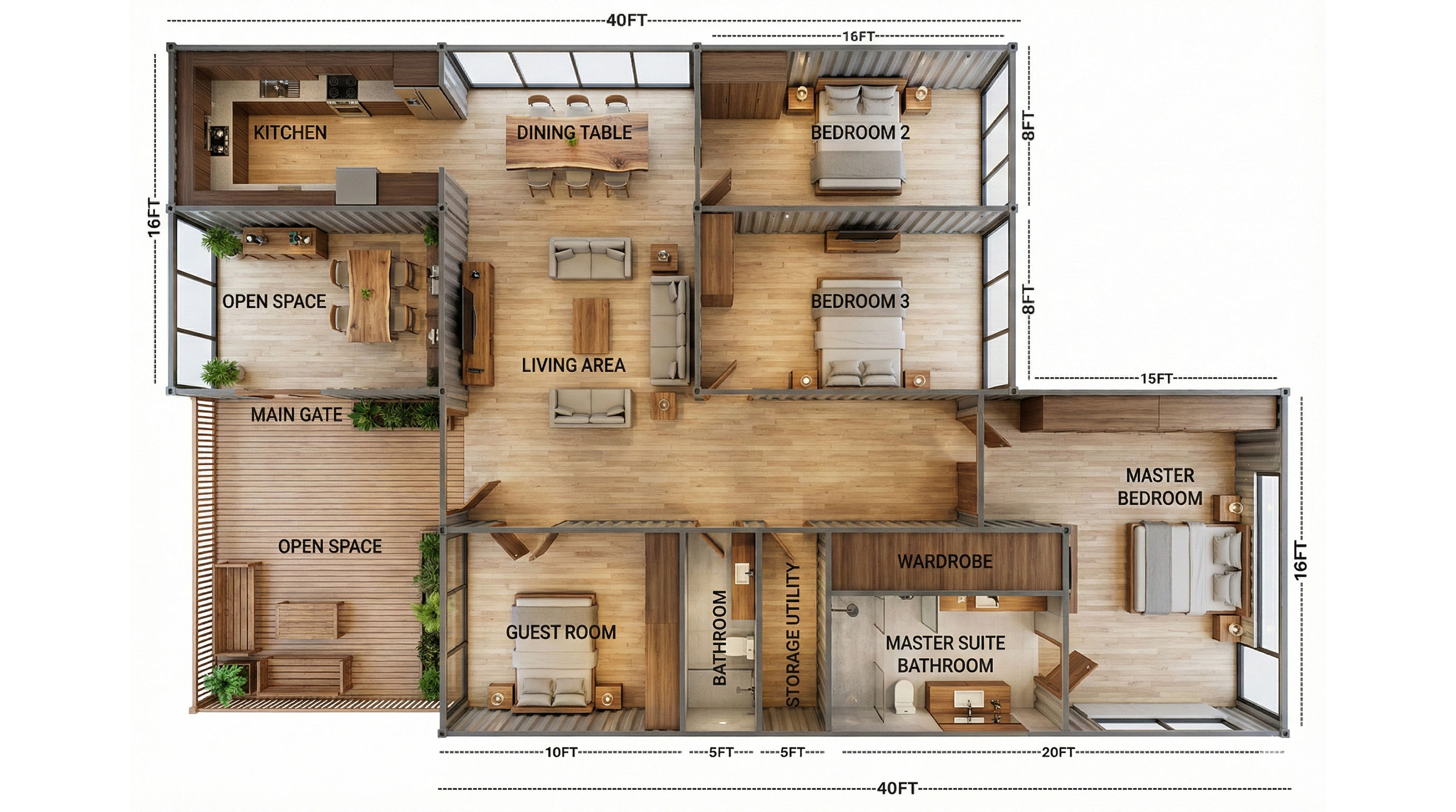 This expansive container home is developed using four 40-foot shipping containers arranged side-by-side to create a wide, single-storey luxury residence. The layout is designed for large families and premium living, offering generous open spaces, multiple bedrooms, and dedicated outdoor sit-out areas.