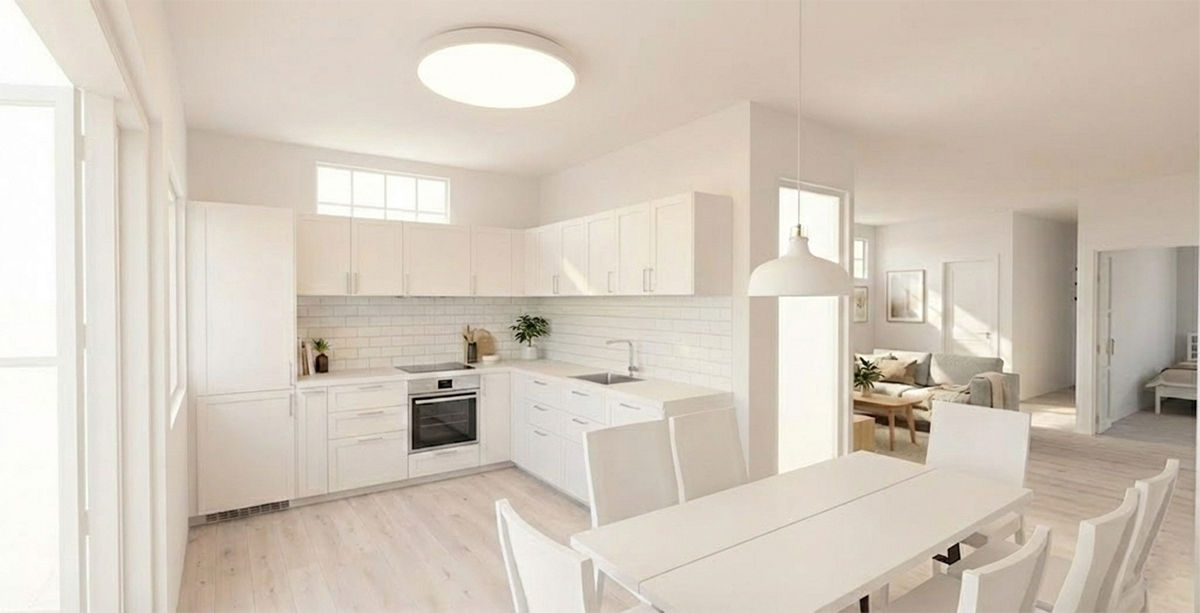 A spacious modular kitchen supported by a dedicated utility storage area.