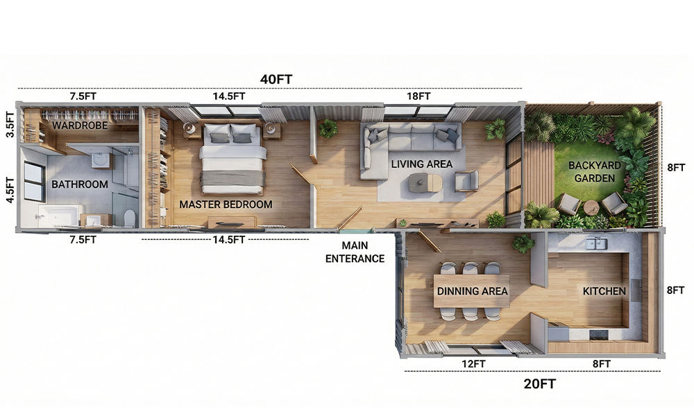 This modern container home is designed using one 40-foot container and one 20-foot container placed side-by-side to create a compact yet highly functional single-storey residence. The layout forms an L-shaped configuration that opens up to a private backyard garden, enhancing indoor–outdoor living.