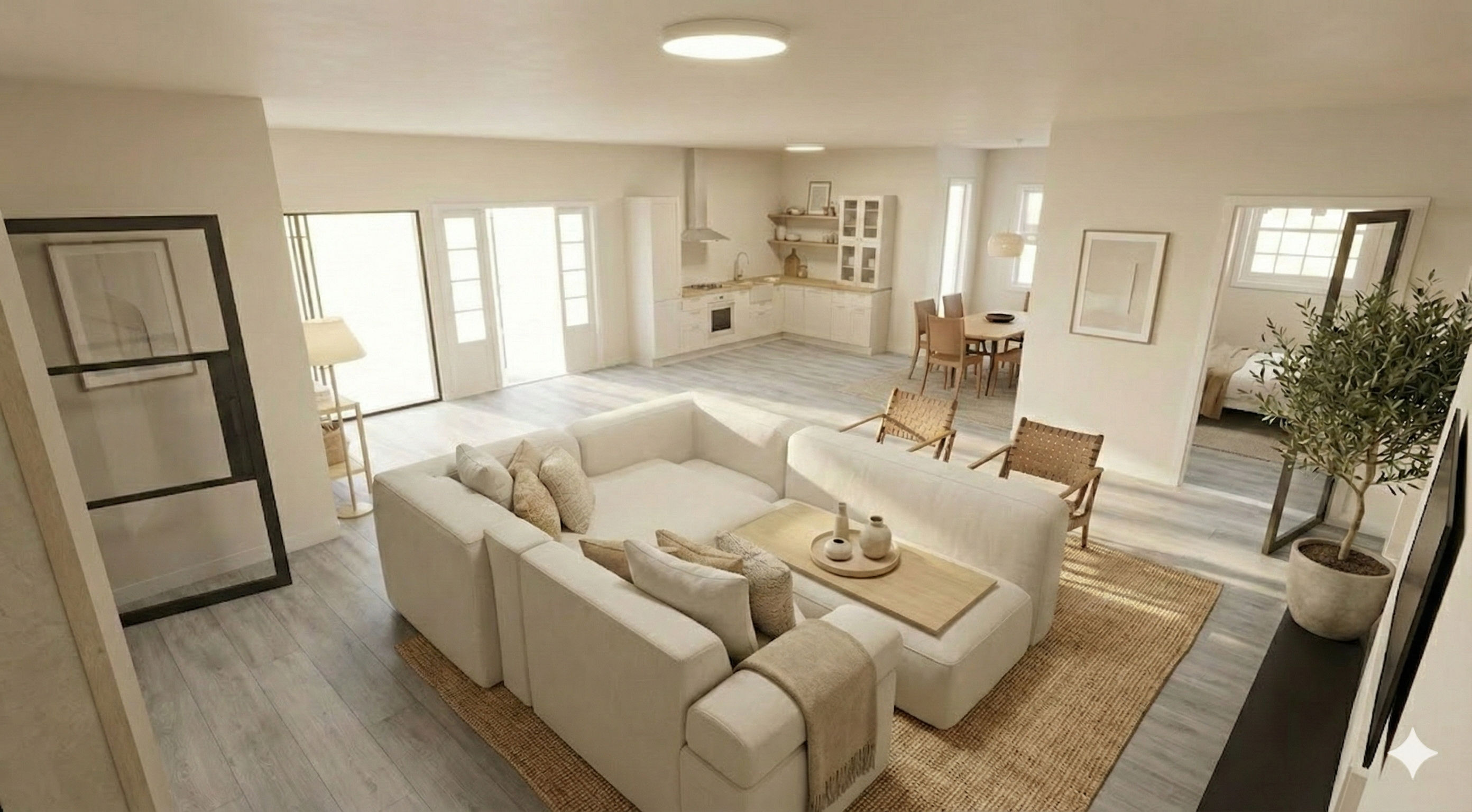 The centrally located open living area serves as the heart of the home, offering a comfortable and spacious environment for family gatherings and relaxation.
